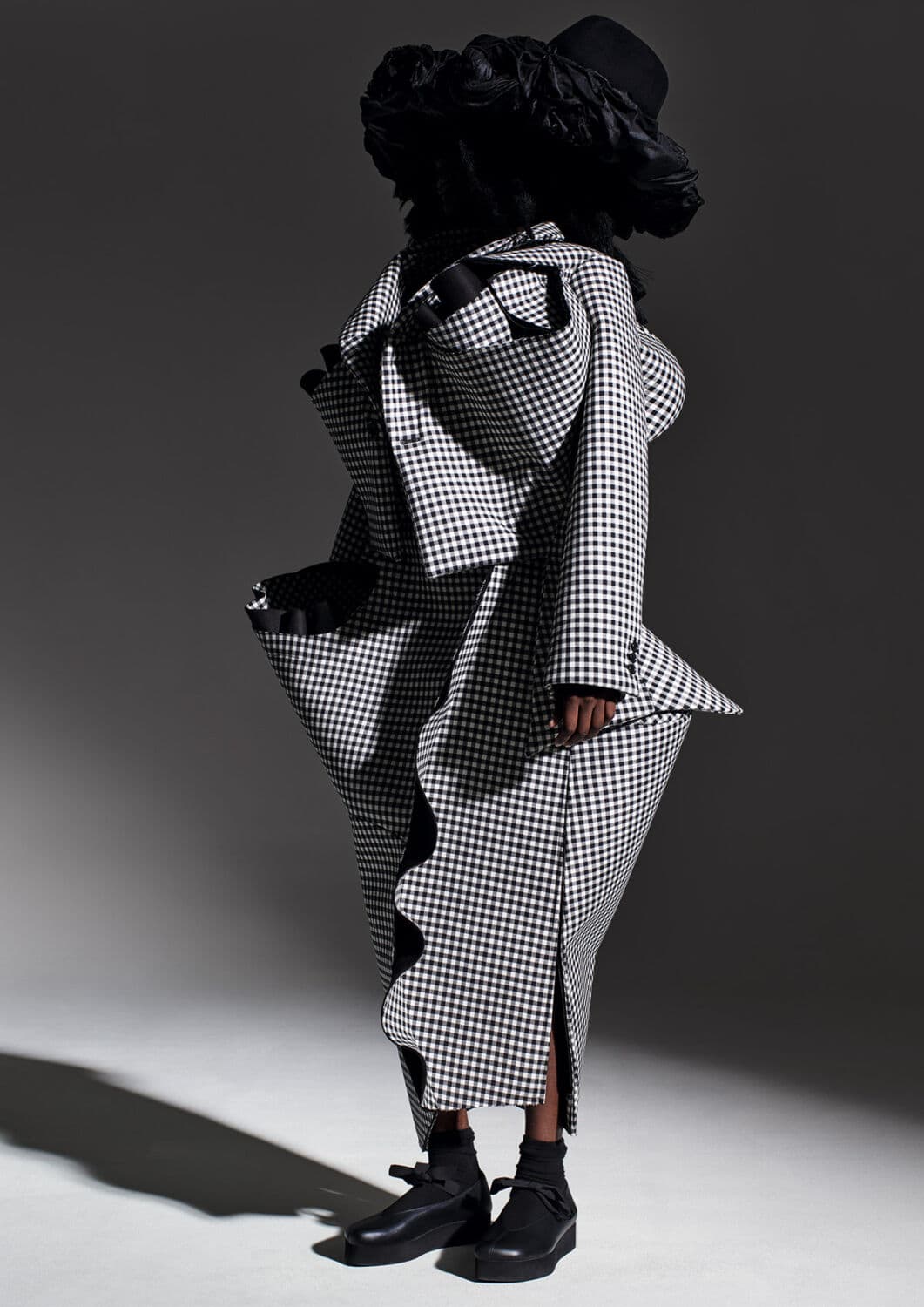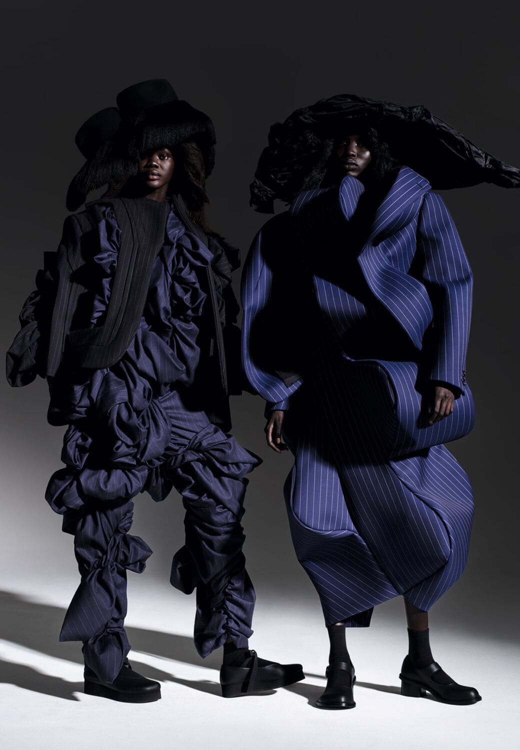 秩序と服従の象徴ともいうべきビジネスウェアは、川久保の手によって制御不能で破壊的なカオスへと姿を変えた。3月にパリで発表された2025年秋冬コレクションのランウェイには、マスキュリンなピンストライプ柄のうねるようなドレスや、突起のようなディテールがあしらわれたハウンドトゥースのジャンプスーツなどが登場した。