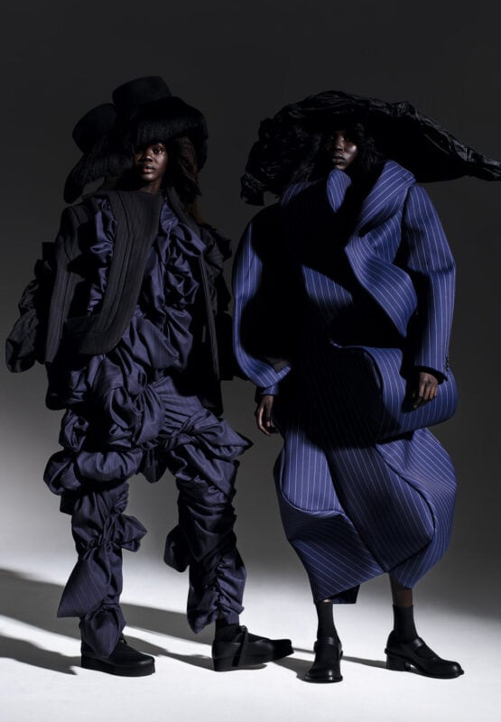 川久保玲は、ピンストライプを使って混迷を深める世界に抗議しようとしたのだろうか。コム デ ギャルソンの2025年秋冬コレクションを手がけるにあたり、川久保は伝統的なビジネスウェアを文字通り破壊した。彼女のそうした行為は、巨大企業が文化を歪めている現実に対する不満を表しているのかもしれない。