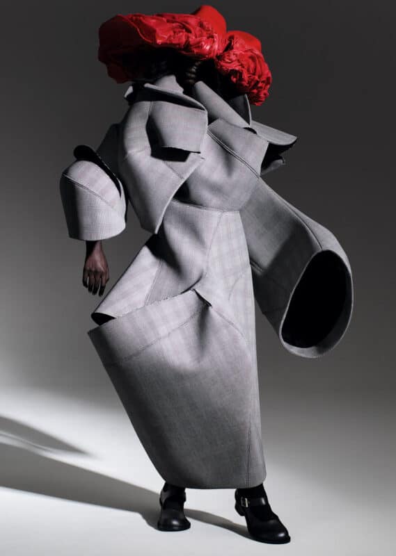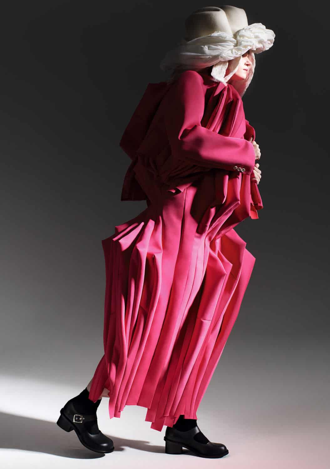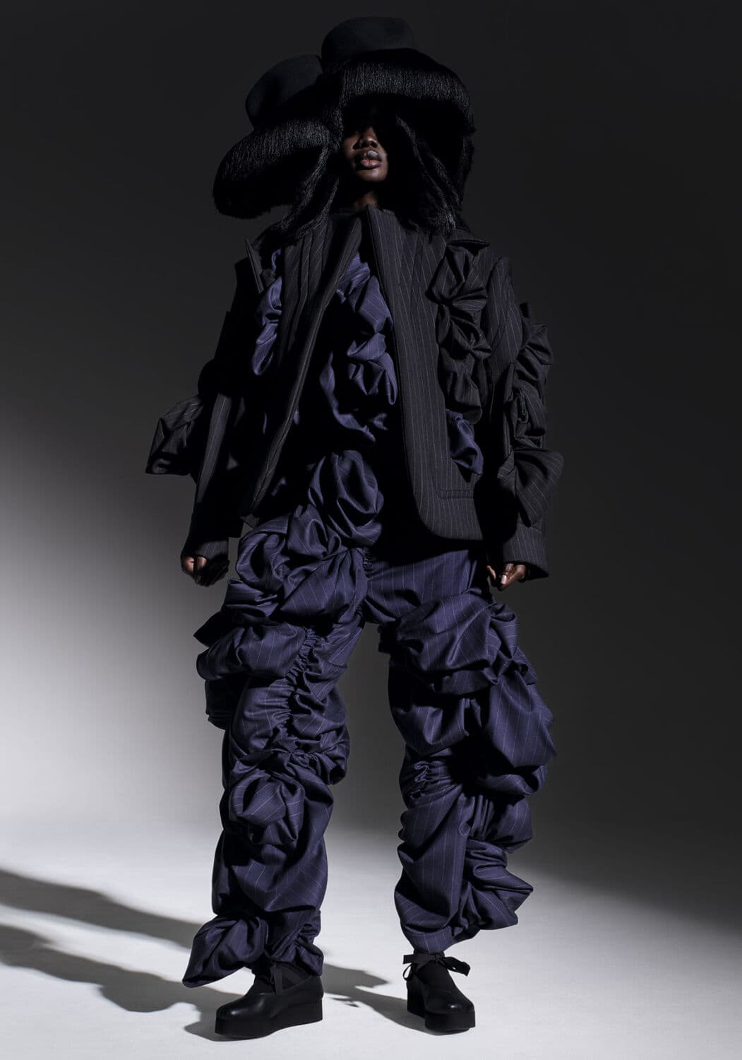 大きな波に飲み込まれ、感覚が麻痺していく時代。今季、秩序と服従の象徴ともいえるビジネスウェアを解体し、「SMALLER IS STRONGER」という思想を服に刻み込んだ川久保玲。その意志を宿した重厚で構築的なフォルムを、6人のモデルが凛とした佇まいで力強く映し出す。
