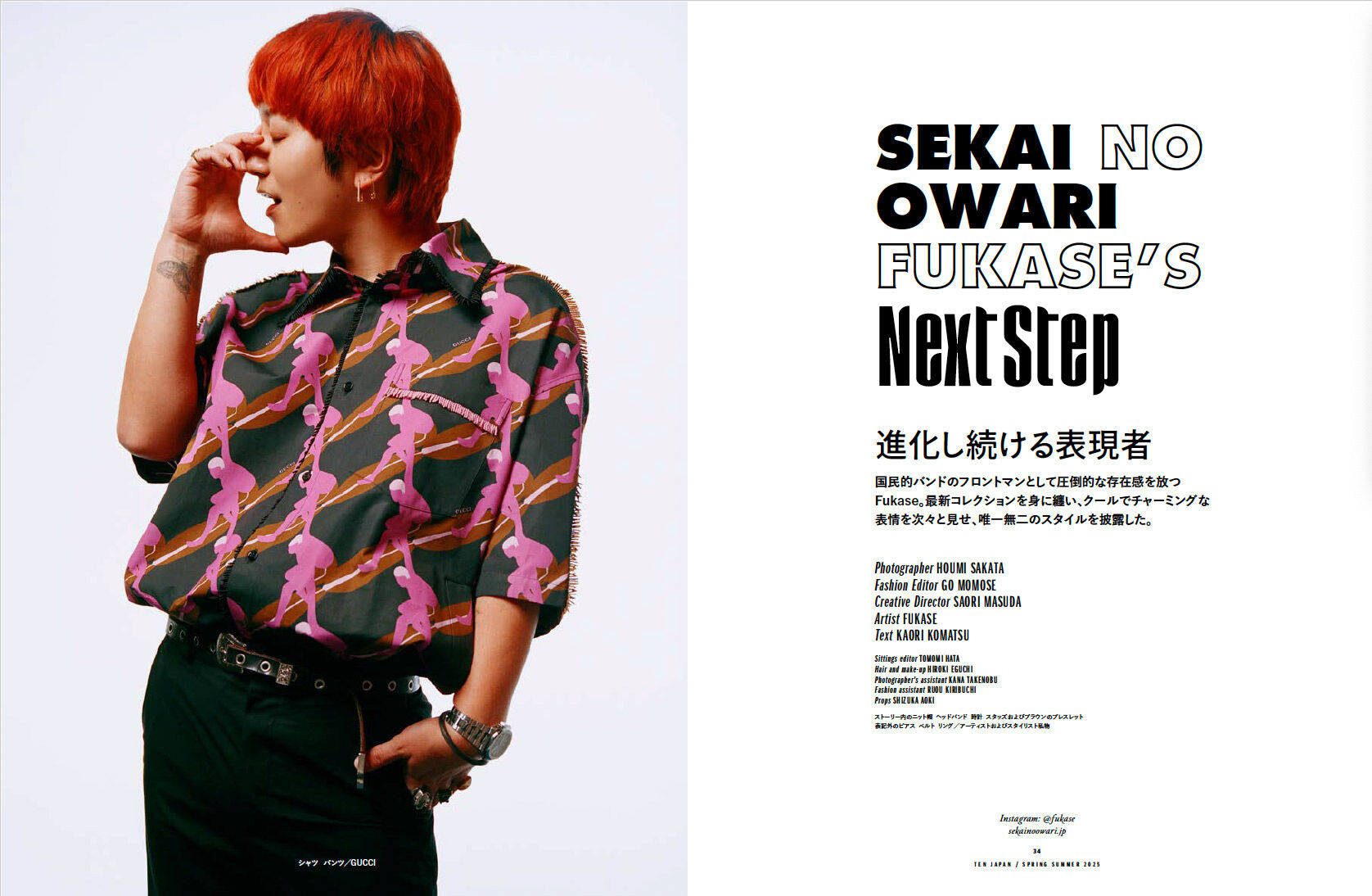 デビュー15周年を迎えるSEKAI NO OWARIのフロントマンであり、バンド全体の⾐装ディレクションも⼿掛けるFukase。2017年のドーム・スタジアムツアー「Tarkus」では、衣装をグッチが提供し、話題となった。バンドの枠を飛び出し単体でも多くのプロジェクトを手掛けているファッションラバーのFukaseが、全16ページにも及ぶカバーストーリーに挑み、その胸中を語ってくれた。