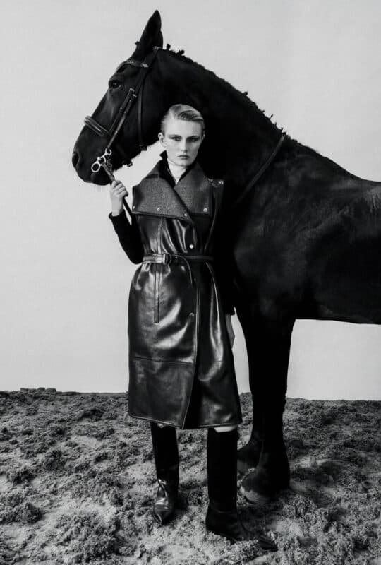2025年秋冬コレクションを制作するにあたり、ヴァンヘはエルメスの伝統である乗馬の世界をさらに掘り下げた。馬術競技場を連想させる円形のランウェイを舞台に、優れた機能性とラグジュアリーを両立させたコレクションが披露された。なかでも目を引いたのは、馬着にヒントを得たブランケットコートと、レザーとフェルトの対照的な質感が楽しめるリバーシブル仕様のアウターだ。それらは彼女のデザイン哲学に刻まれている、エルメスのクラフツマンシップにしか生み出せないモジュラーで変幻自在なデザインを体現していた。