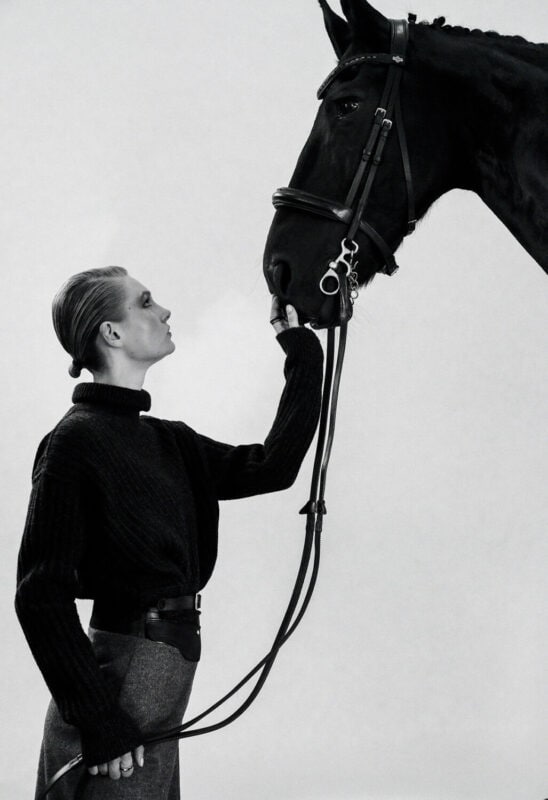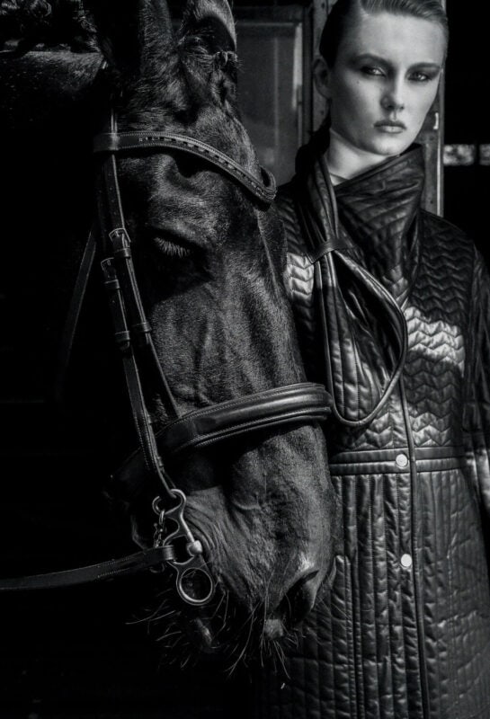 「鞍づくりには、私たちの想像をはるかに超えた技術と知識が注ぎ込まれています。そのことを知り、服をデザインするアプローチも変わりました」と彼女は語る。「ファッションデザインでは動きやすさが重視されがちですが、安定性(心地よさ)も重要です。動いたときに生地がすべり落ちるようではいけません」。