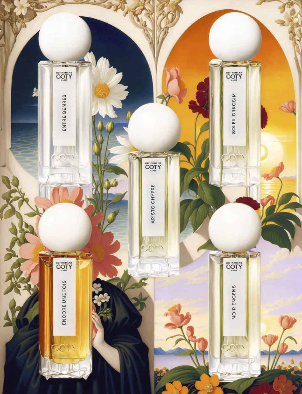 clockwise from top left: the five fragrances that make Infiniment Coty Paris’s ‘I Am Day collection’: Entre Genres, Soleil D’Ikosim, Noir Encens, Encore Une Fois and Aristo Chypre