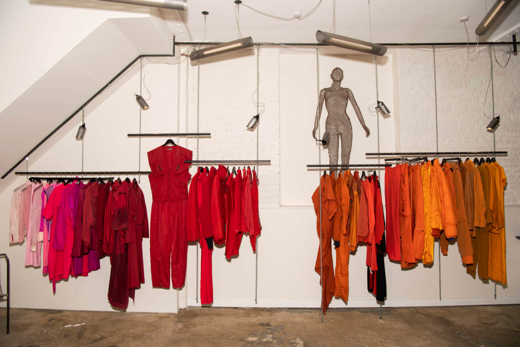 インダストリアルな建物の一隅にあるアロ・アーカイブ(Aro Archive)に一歩足を踏み入れると、ダルストンを貫くキングスランド・ハイストリートの喧騒とはまったくの別世界が待っている。コンクリートを基調としたこの空間において一際目を引くのは、磔刑のキリストのようなメッシュのマネキン。ラックにかけられた服がシルバーからホワイト、クリーム、そしてフューシャピンクへと移ろい、鮮やかなレッドやシャープなオレンジといったポップな色調へと変化する。ここにあるヴィンテージ作品は、1万2000点を超える。専門は、ヨウジヤマモト(Yohji Yamamoto)、イッセイミヤケ(Issey Miyake)、コムデギャルソン(Comme des Garçons)、ヘルムート ラング(Helmut Lang)、メゾン マルジェラ(Maison Margiela)、ラフ シモンズ(Raf Simons)、アン ドゥムルメステール(Ann Demeulemeester)、ジャンポール・ゴルチエ(John Paul Gaultier)といったデザイナーズブランドだ。