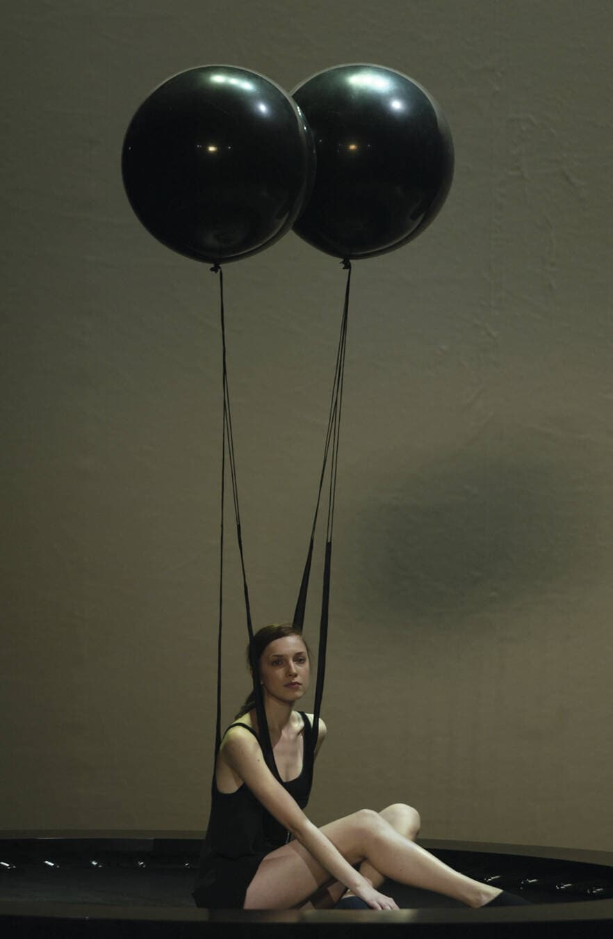 フセイン・チャラヤンと彼がデザインした衣装「Gravity Fatigue」を着たダンサー、2015年サドラーズウェルズ劇場にて