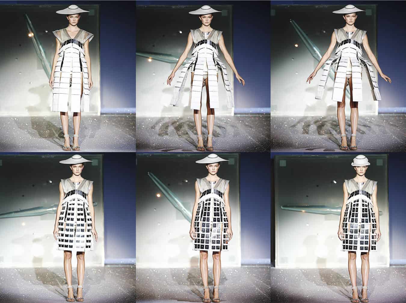 「これはテクノロジーと詩的で叙情的で軽やかなものとの興味深い融合でした。同時に、とてもパフォーマティブな印象を持っています」と、チャラヤンはファイバーグラスを使ったリモコンドレスと、メモリーワイヤーで広がるドレスを起用したコレクションについて語った。