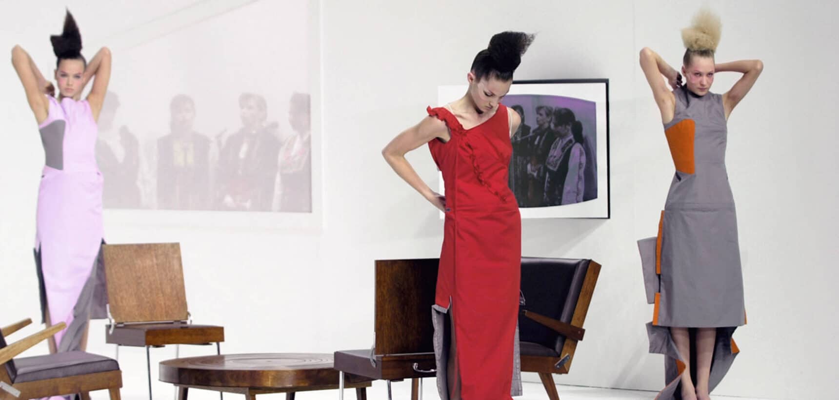 ロンドンにあるサドラーズウェルズ劇場の舞台には、4脚の椅子とテーブル、薄型テレビ、オブジェでいっぱいの棚からなる、ミニマルな白いリビングルームが再現された。まずは、ごく普通の家族(母親、父親、祖母、子供)に扮した人物がステージに上がり、壇上を歩いた。続いてモデルたちが登場し、部屋にあるオブジェを手に取り、特別にデザインされたポケットに押し込んでいく。次に、別のモデルたちが椅子の張り地を剥がし、ドレス代わりにする。椅子は魔法のように折り畳まれ、スーツケースに姿を変えて持ち去られた。
