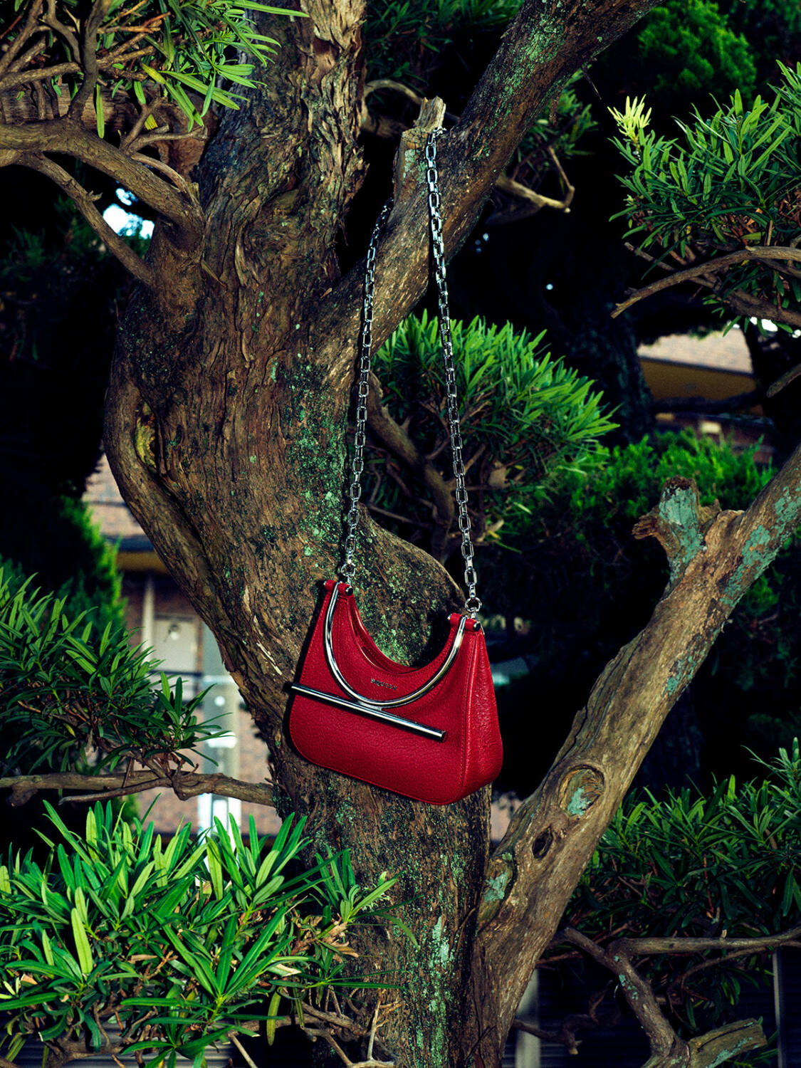 マックイーンの「Tバー」バッグは、Tバーの円形ハンドルと取り外し可能なシルバートーンメタルのチェーンストラップがシャープな印象に。目を惹くレッドカラーとボディにすっぽりと収まるラムレザーのなめらかな質感が、女性のしなやかな内面を描いているよう。さりげなくあしらったロゴのエングレービングがキラリと光る、毎日の相棒となる逸品。
