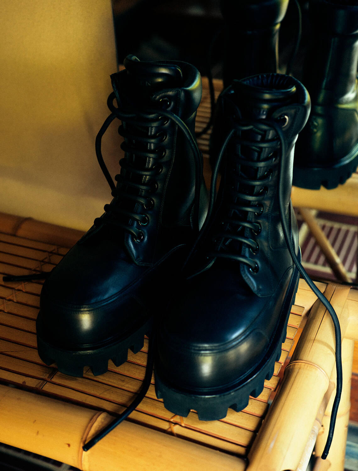 コーディネートの主役となるチャンキーなブーツは、レースアップをチョイスして、程よくレディ感を漂わせる足もとに。無骨さを持ち合わせるタンクソールと艶やかなラウンドトゥの絶妙なバランス感を狙うのが、お洒落上級者の見せどころ。聖なる夜はモードな一足で、煌めく街を闊歩して。