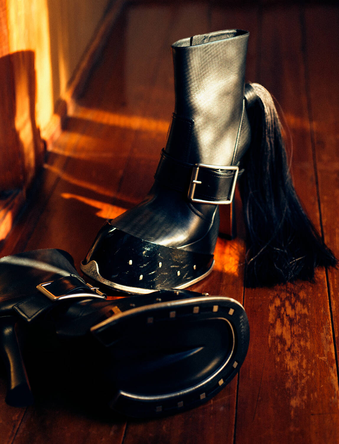 擬人化されたひづめをイメージした「フーフ」ブーツを纏えば、たちまちクリスマスムードも一気に盛り上がる。ブラックの艶めくスムースレザーに、ビッグなバックルをあしらい、馬蹄形ソールにはメタルスタッズを散りばめ特別感を演出。付属のシルクのポニーテールで堂々した佇まいに。