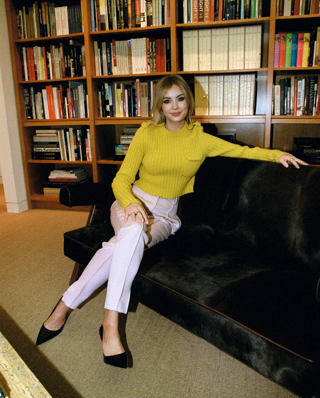 アナ・ウェイヤントが着用しているのは、プラダのセーターとパンツ、そしてシューズ