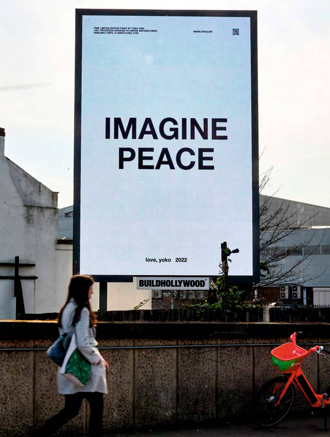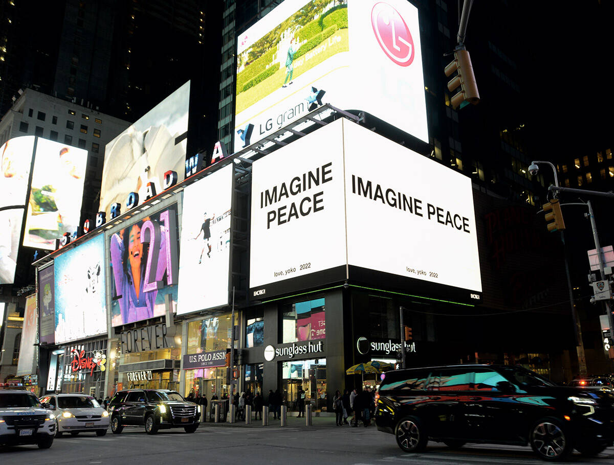 「私たちは、公共の場でアート作品を目にするとは思っていません。だからこそ、帰宅途中や通勤中にアートと出会うことに大きな衝撃を受けるのです」。シェリックスも、こうした商業スペースを使うことは「世界を変えるには美術館もギャラリーも出版社も必要ない、というオノの初期の信念を発信することでもある」と指摘する。確かに、資本主義の象徴ともいうべきタイムズスクエアのような場所で「平和な世界を想像してごらん」と訴えるのは、ディスラプティブな行為である。資本主義の本質は現状を維持することであり、それ以外のことを想像する余地を許さないのだから。