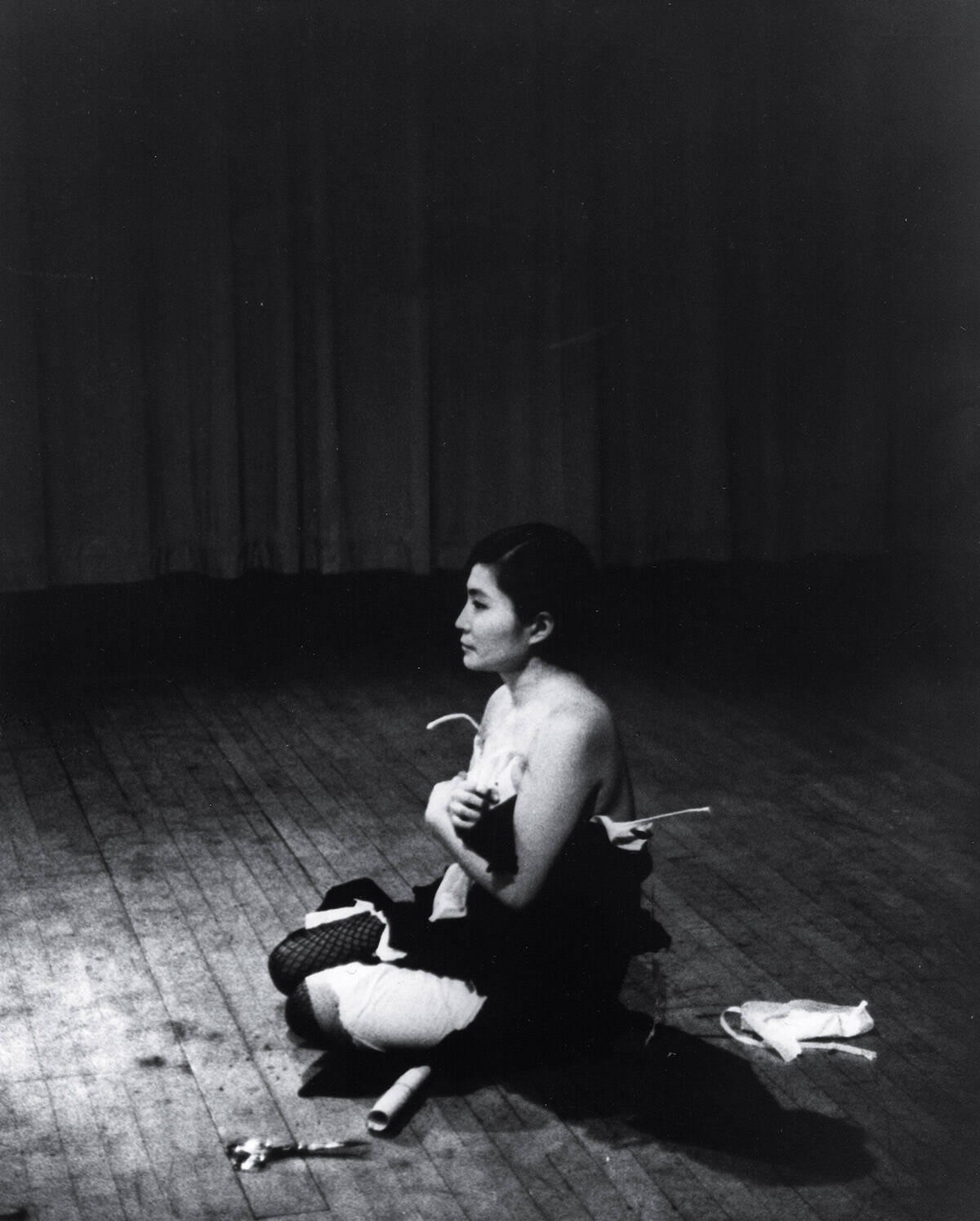1964年、「カット・ピース」。ステージ上スーツを着たオノが座り、オーディエンスがハサミを使って少しずつオノの服を切り取っていく先駆的なパフォーマンスアート。 PHOTO BY MINORU NIIZUMA © YOKO ONO