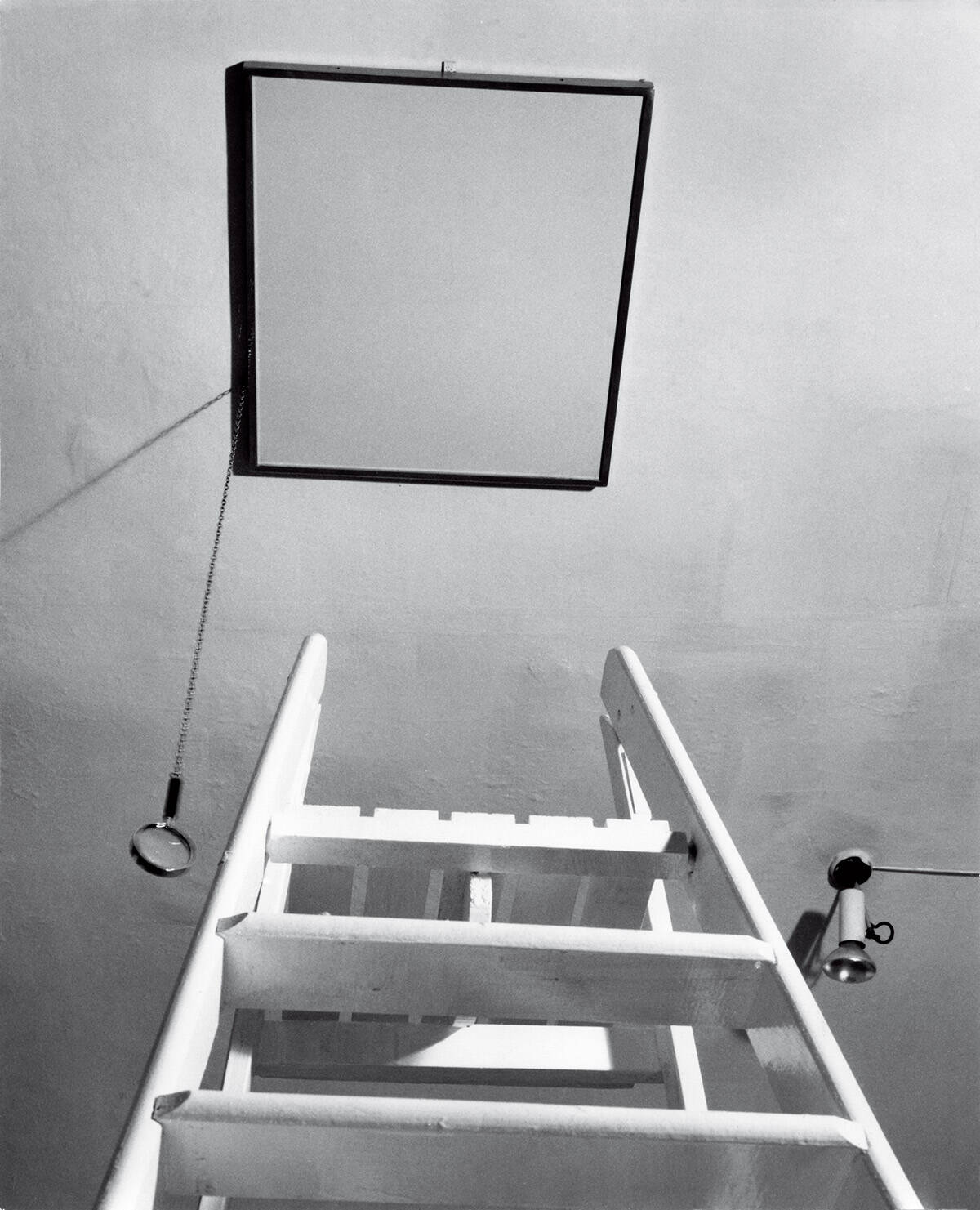 1966年、「Ceiling Painting/Yes Painting(天井の絵)」。来場者は、部屋の真ん中に置かれた梯子をのぼり、天井からぶら下がる虫眼鏡でのぞくと小さな文字で「YES」と書いてある文字を読むという作品。 PHOTO BY IAIN MACMILLAN © YOKO ONO