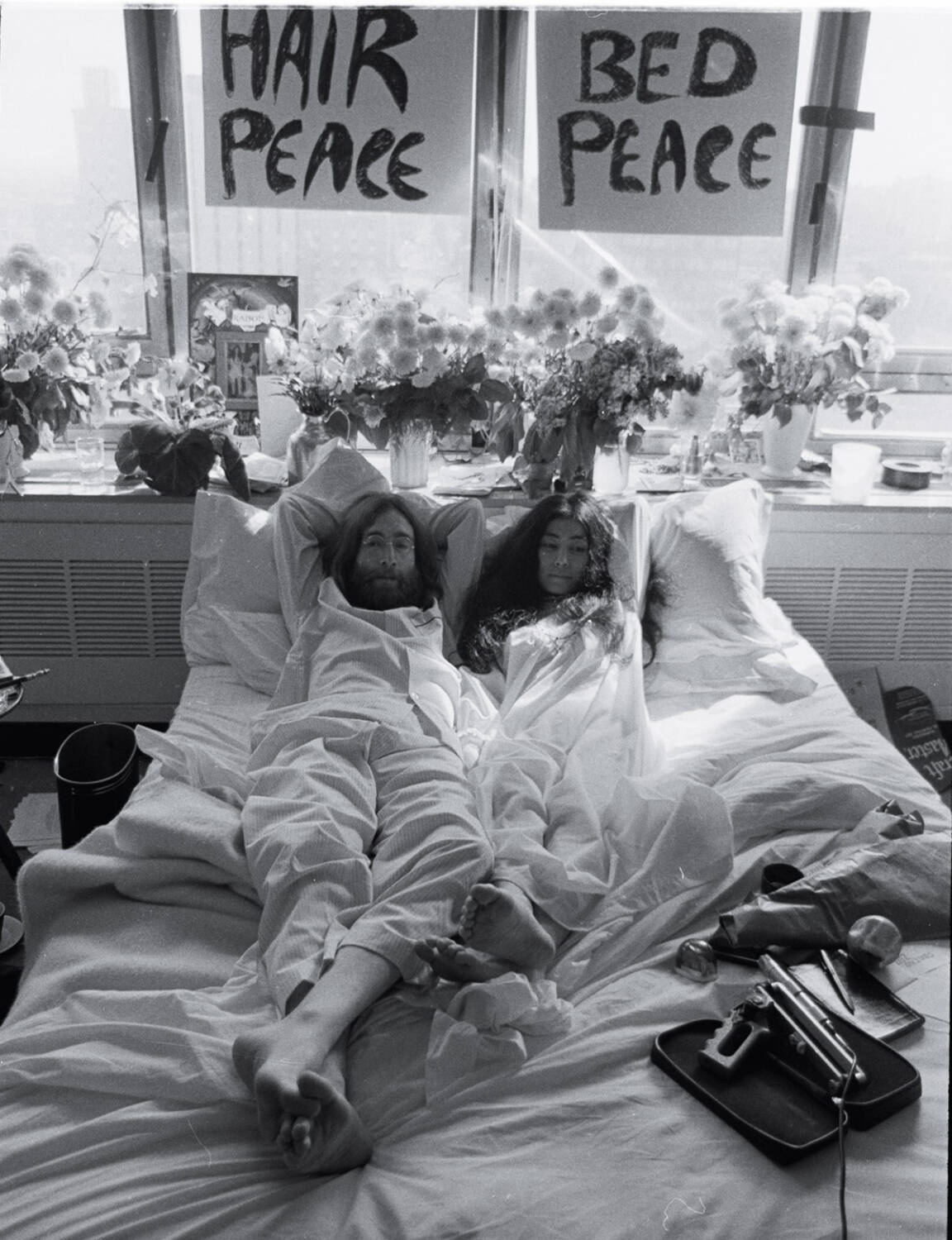 ふたりは交際をはじめ、1969年に結婚した。レノンの妻として一躍時の人となったオノの作品は、それまでは彼女の作品に興味を示さなかった人々にも知られるようになった。レノンとオノは、新婚旅行で訪れたアムステルダムとモントリオールのホテルで「ベッド・イン」と題した平和のためのパフォーマンスを行い、終わりの見えないベトナム戦争に抗議した。座り込みといった非暴力的な抗議活動からヒントを得たふたりはホテルの寝室にジャーナリストたちを招待し、平和について議論した。1970年には巨大広告やポスター、ラジオCM、ポストカードを使ったマルチメディアキャンペーンに打って出、「War Is Over! If You Want It. Love and Peace from John & Yoko」というメッセージを発信するかたわら、「イマジン」を共作した。この曲の歌詞は『グレープフルーツ・ブック』から着想を得たといわれている。当時のオノについて評論家のリンジー・ゾラッズは、2015年に米隔週刊誌『ニューヨーク・マガジン』に次のように寄稿した。「オノの芸術は、前衛の枠を超えたことで命を与えられました。オノには、チェンバーズ・ストリートのロフトで起きていることに詳しいクールなアート好きだけでなく、すべての人の心のなかに眠る芸術家を呼び覚ますという使命があったからです」