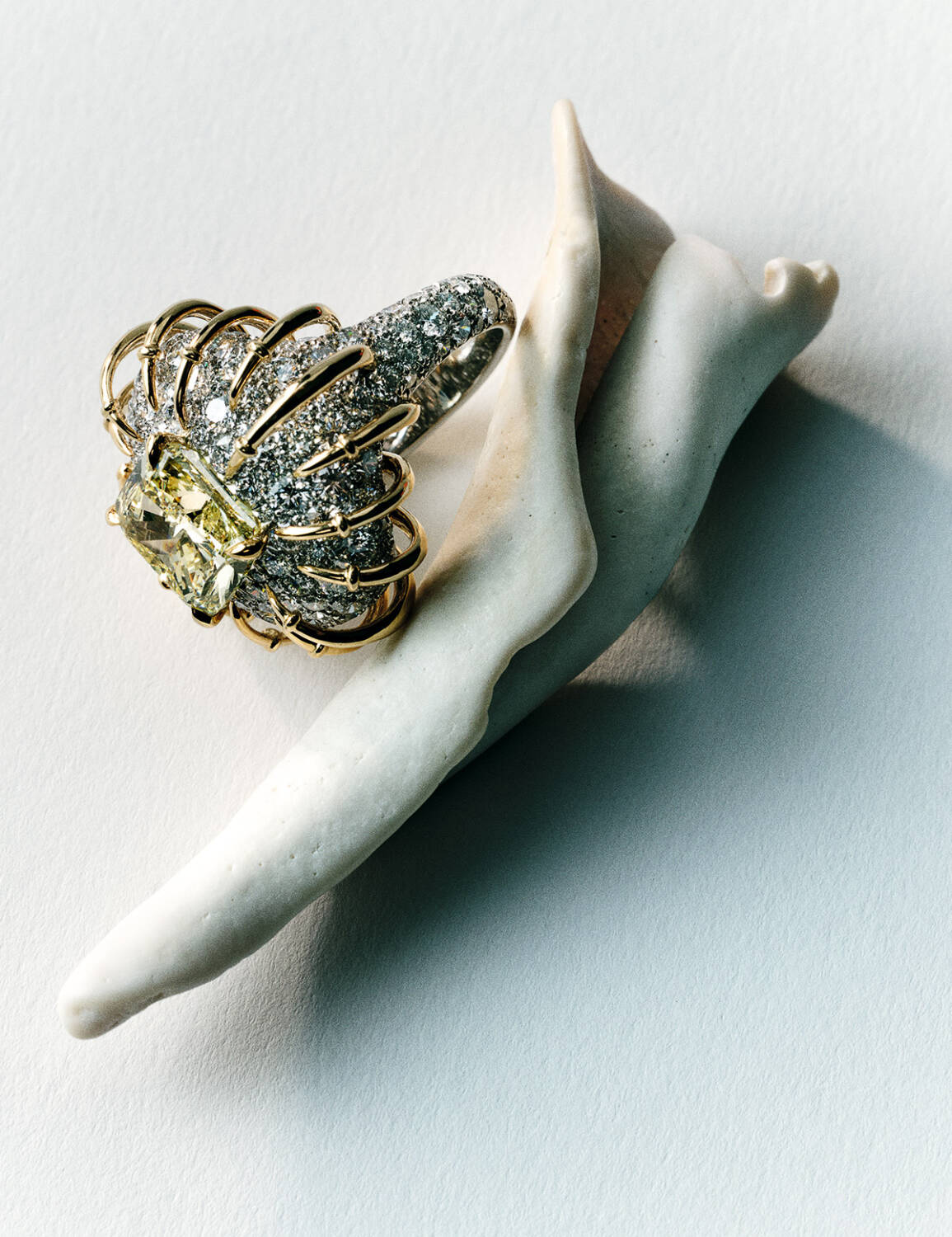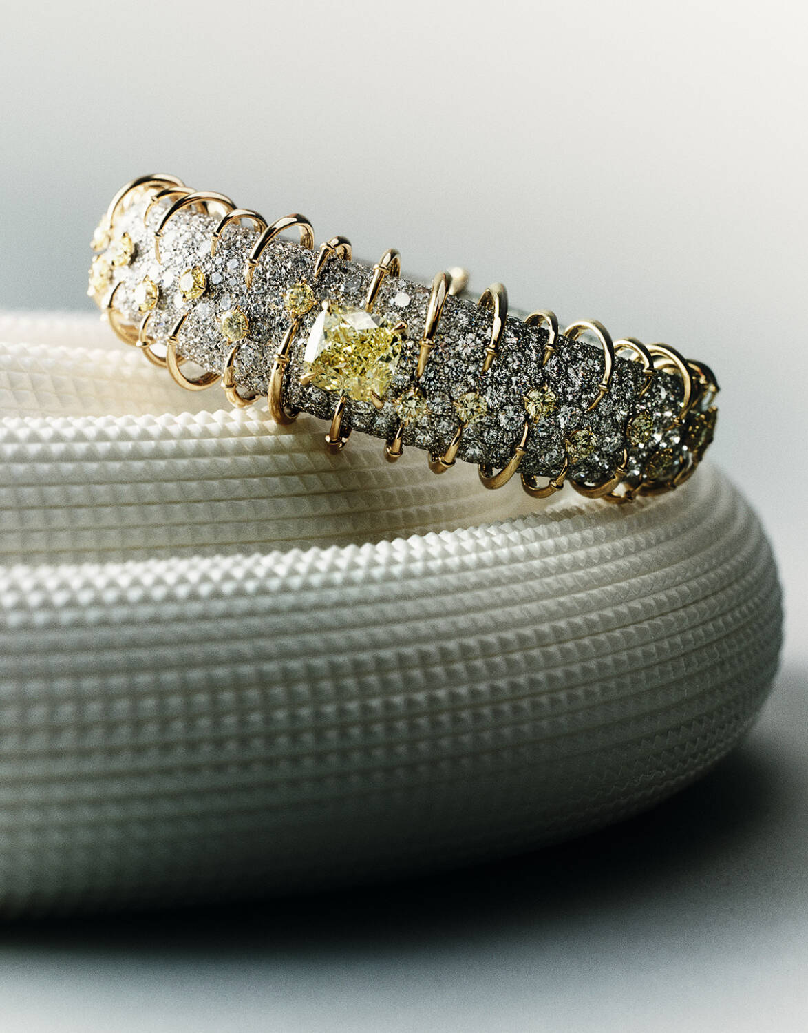 「ウィングス」「アロー」「コンステレーション」「アイコニック スター」「レイ オブ ライト」「アポロ」という独創的な6つのテーマで展開されるこのスプリングコレクションは、さながら夜空の神秘を紐解く壮大な旅の物語である。たとえば「アポロ」のインスピレーション源は、シュランバージェがデザインした壮麗な「アポロ ブローチ」。ティファニーを象徴するイエローダイヤモンドとホワイトダイヤモンドに、新たな息吹が吹き込まれた。