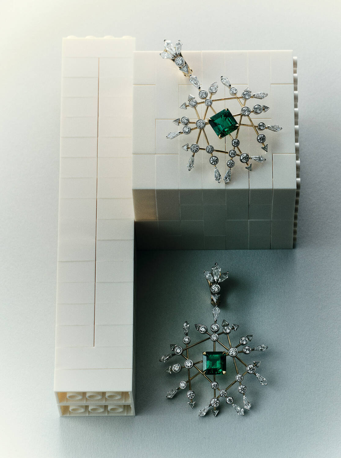 一方で「アロー」の主役は、独自技術によってカットされたコロンビア産エメラルド。その名の通り、矢(アロー)をモチーフとした形が天体の軌道を想起させる。