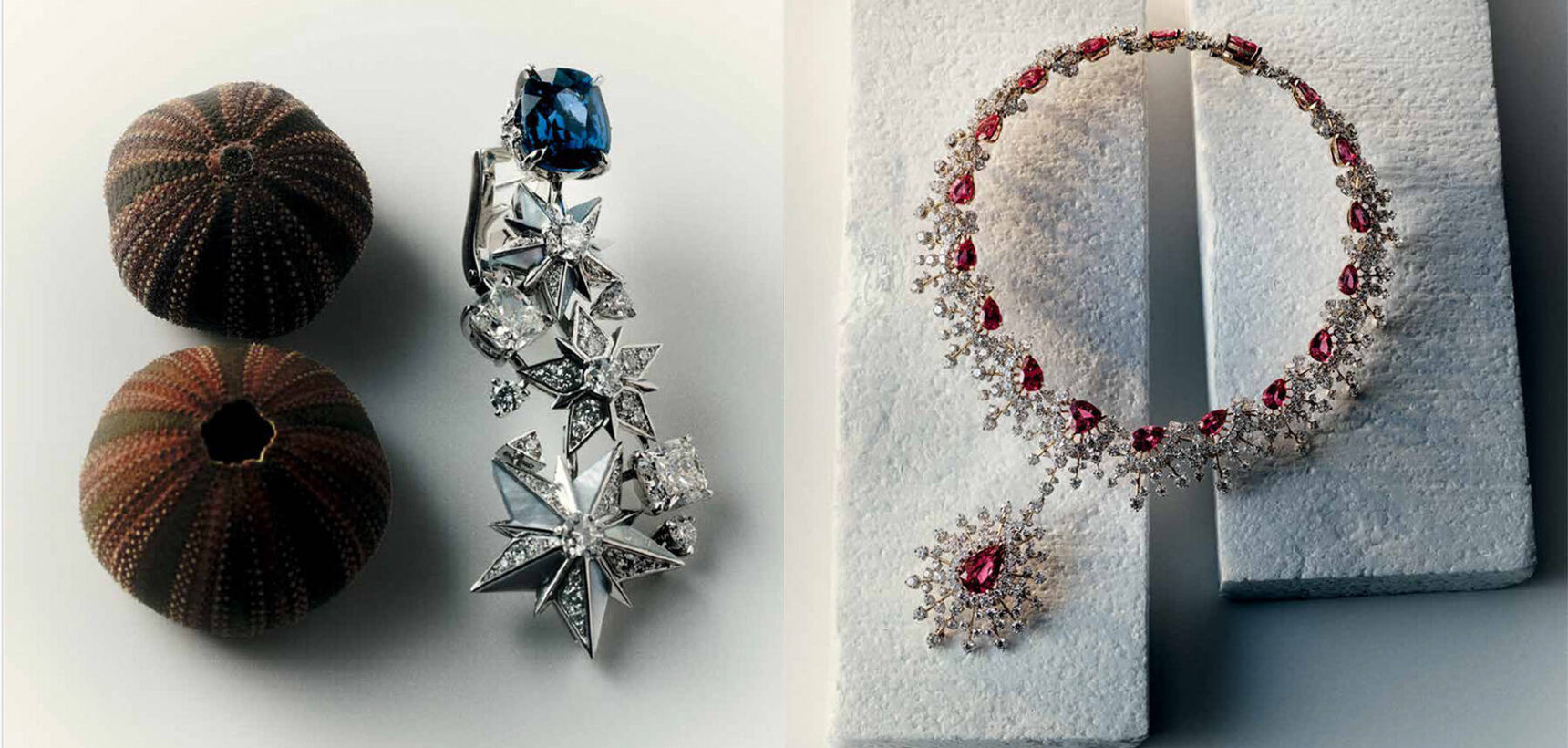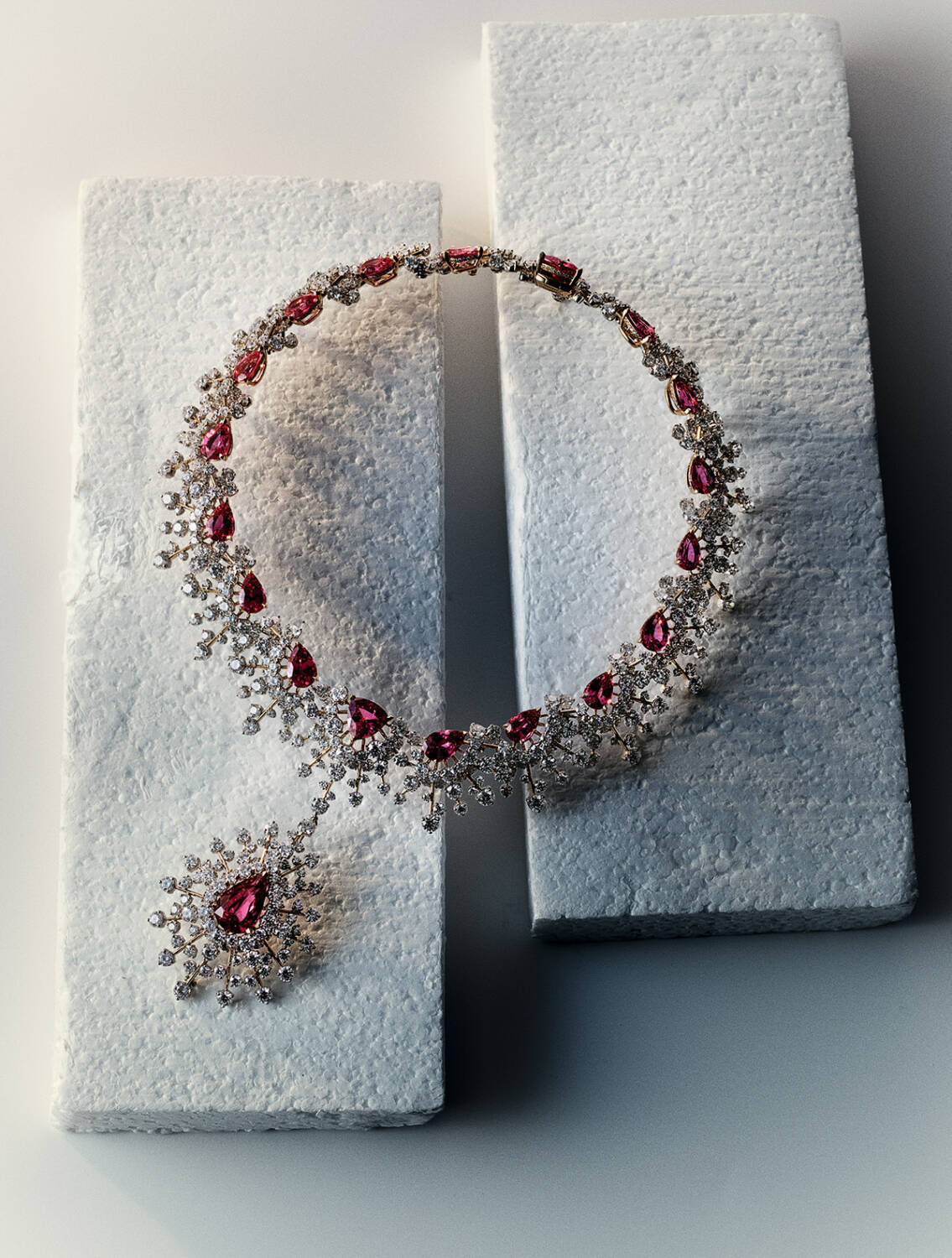 さらには、飛翔とファンタジーを象徴する「ウィングス」、とらえがたい太陽の光を再現したレッドスピネルを主役に据えた「レイ オブ ライト」など、コレクションを構成するひとつひとつの作品が天空の神秘を物語る。中でも、ネックレスからブローチに組み替えられる「レイ オブ ライト ネックレス」は、星座の移り変わりを表現した特別な作品である。